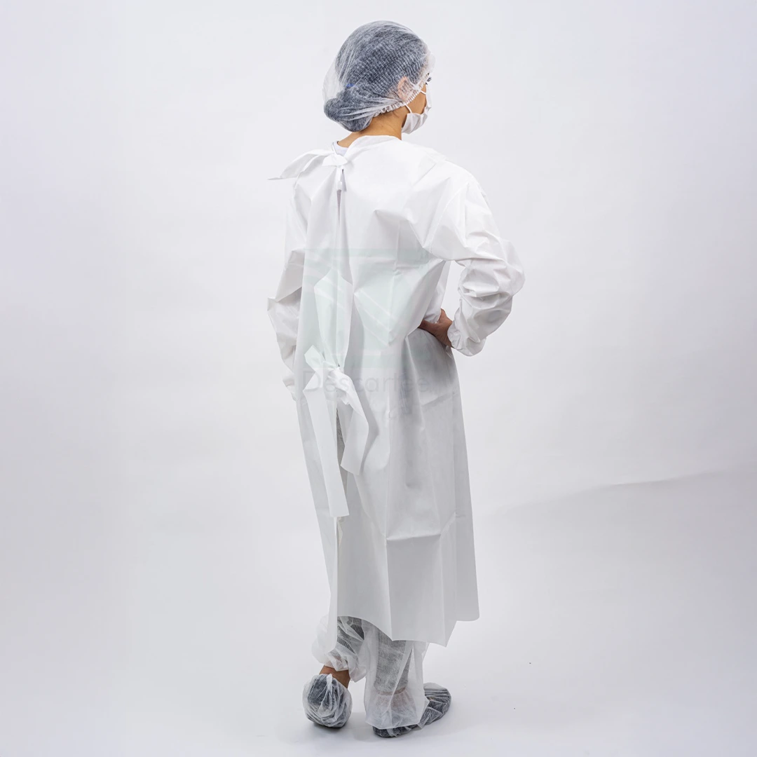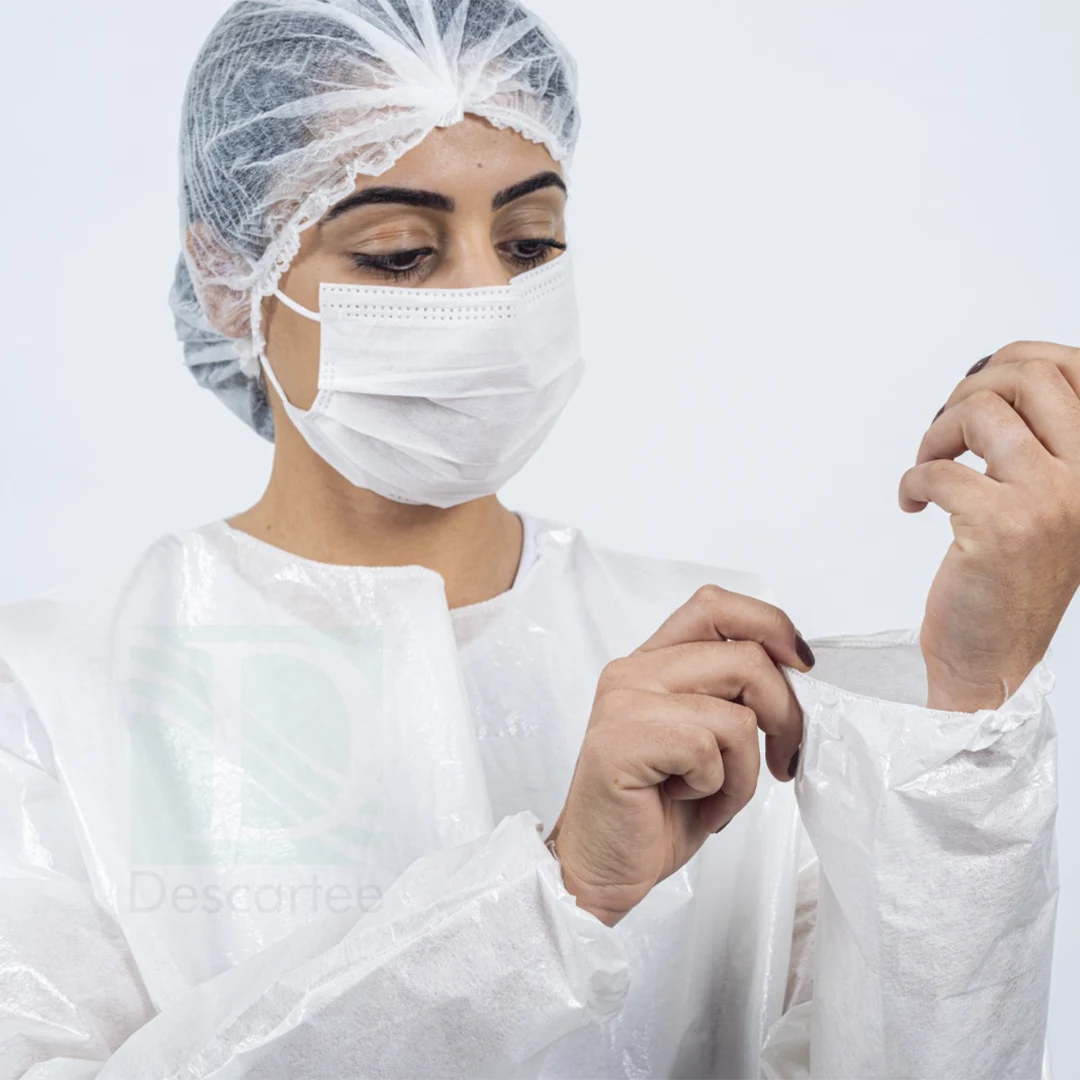 Avental confeccionado em TNT (tecido não tecido), com manga longa com elástico, 100% polipropileno, uso único, não estéril, protege o corpo do profissional contra possíveis contaminações por líquidos corpóreos ou substâncias contaminantes.